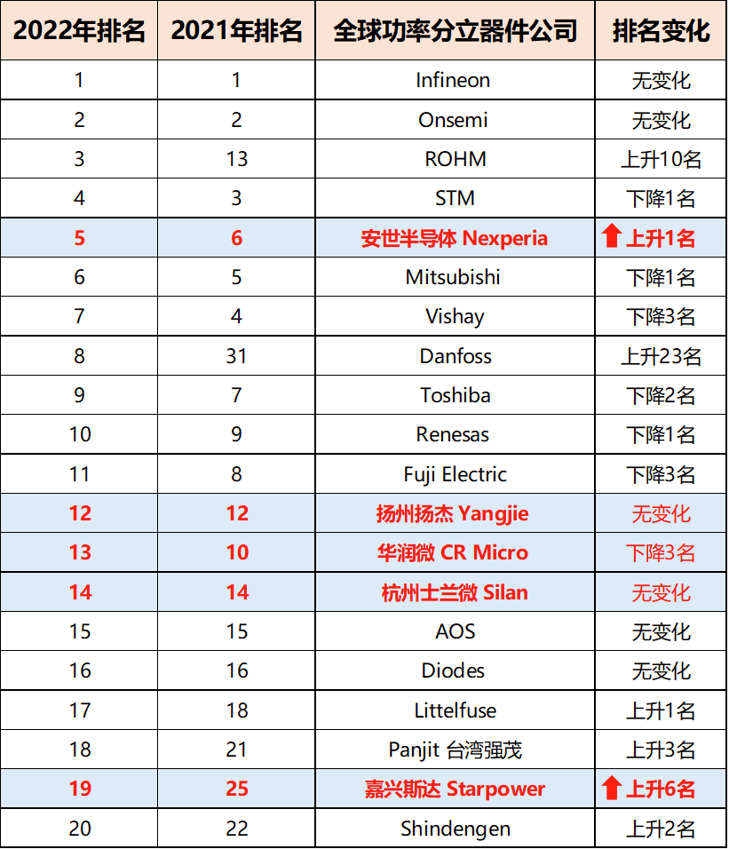 2022年全球功率分立器件行业前20公司排名及变化