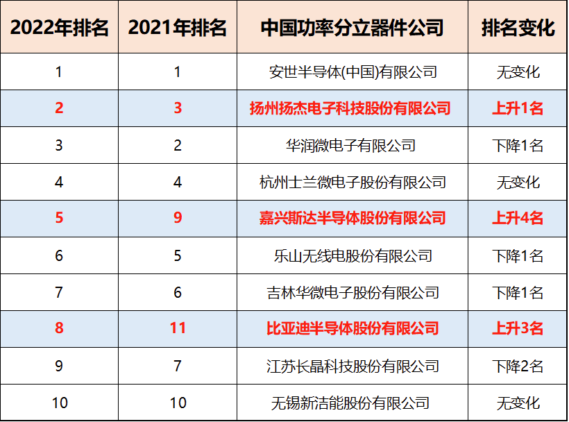 2022年中国功率分立器件行业前10公司营收与排名
