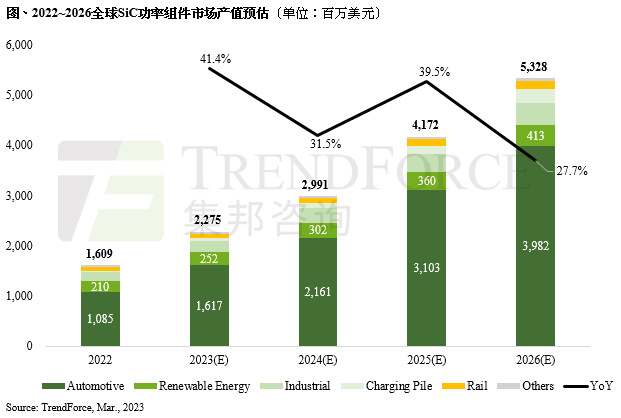 据TrendForce研究统计,随着安森美(onsemi)、英飞凌(Infineon)等与汽车、能源业者合作项目明朗化,将推动2023年整体SiC功率元件市场产值达22.8亿美元,年成长41.4%。