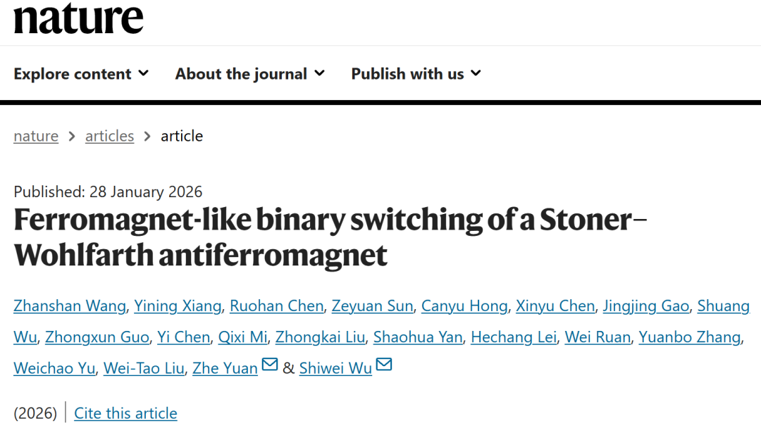 值得一提的是,1月29日凌晨,复旦大学两支科研团队的成果在《自然》同期发表。除"青鸟"系统外,另一项成果是复旦大学应用表面物理全国重点实验室吴施伟、袁喆研究团队关于低维反铁磁"集体舞蹈"的研究,题为《斯通纳-沃尔法思反铁磁体的铁磁型双稳态翻转》(“Ferromagnet-like binary switching of a Stoner–Wohlfarth antiferromagnet”)。