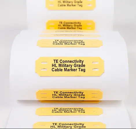 捆绑式电缆标志可用于在预端接或端接后标识大型电缆和线束。 配合束线带使用,通常用于公共交通、军事和航空航天领域。外观为折叠式或卷绕式纸带上排列的标志,以提供更大范围的打印格式。
